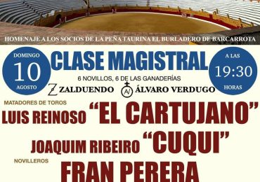 Realiza-se no próximo dia 10 de Agosto em Barcarrota uma classe magistral com participação de vários portugueses. Frente a estados das ganadarias Zalduende e Álvaro Verdugo, actuam El Cartujano, Cuqui…