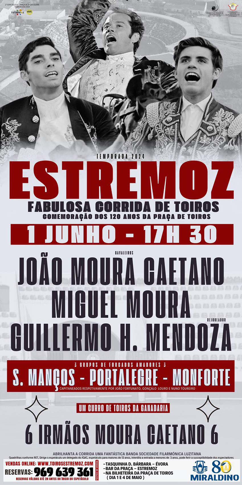 Frente a toiros da ganadaria Irmãos Moura Caetano, actuam os cavaleiros João Moura Caetano, Miguel Moura e Gillermo H. de Mendonza.