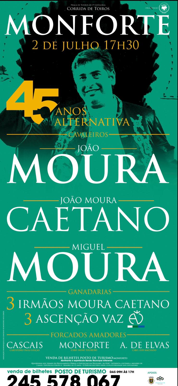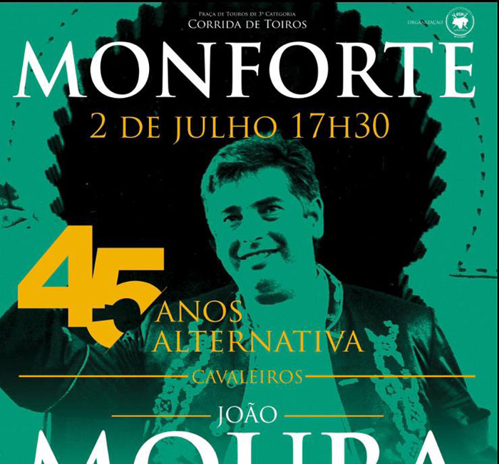 No próximo dia 2 de Julho pelas 17h30, grandiosa corrida de toiros em Monforte para comemorar os 45 anos de alternativas de João Moura.
