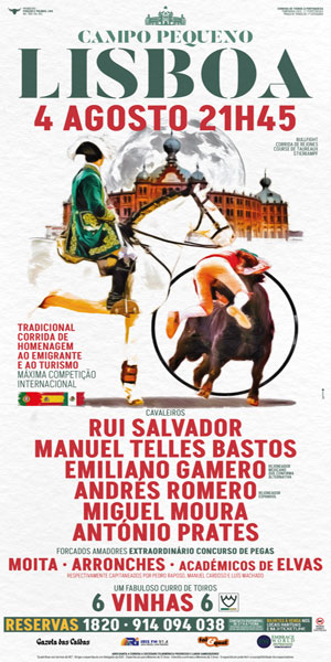 Do México chega a estreia na praça lisboeta do cavaleiro Emiliano Gamero, do país-vizinho volta Andres Romero e o contingente português conta com um cartel de luxo: Rui Salvador, Manuel Telles Bastos, Miguel Moura e António Prates.