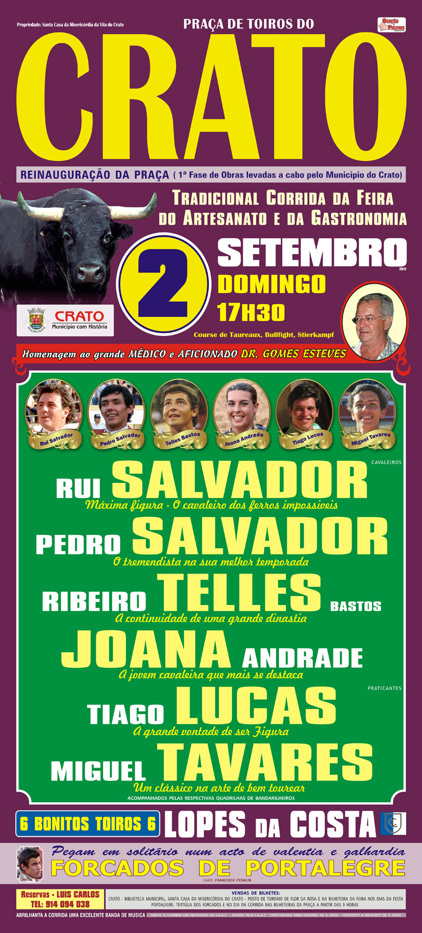 O cartel de homenagem ao médico e aficionado Dr. Gomes Esteves, apresenta seis toiros de Lopes da Costa para os cavaleiros Rui Salvador, Pedro Salvador, Manuel Telles Bastos, Joana Andrade e os praticantes Tiago Lucas e Miguel Tavares – e, em solitário os Amadores de Portalegre.