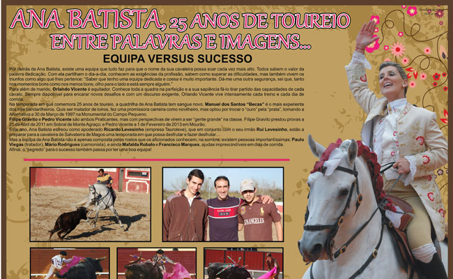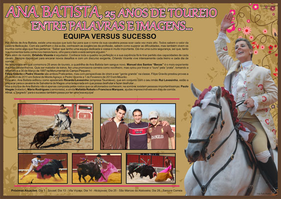 A brochura termina ainda com outras referências, dizendo que a equipa de Ana Batista “não é apenas composta pelos rostos que os aficionados conhecem; na sombra, existem pessoas importantíssimas: Paulo Viegas (tratador), Mário Rodrigues (camionista) e ainda Mafalda Robalo e Francisco Marques, ajudas imprescindíveis em dias de corrida.”