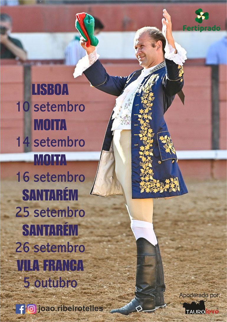 Depois do triunfo gordo em Montemor no passado domingo, na corrida de homenagem ao saudoso Simão Comenda, João Ribeiro Telles está contratado para amanhã no Campo Pequeno, 14 e 16 na Moita do Ribatejo, 25 e 26 em Santarém e 5 de Outubro em Vila Franca de Xira.