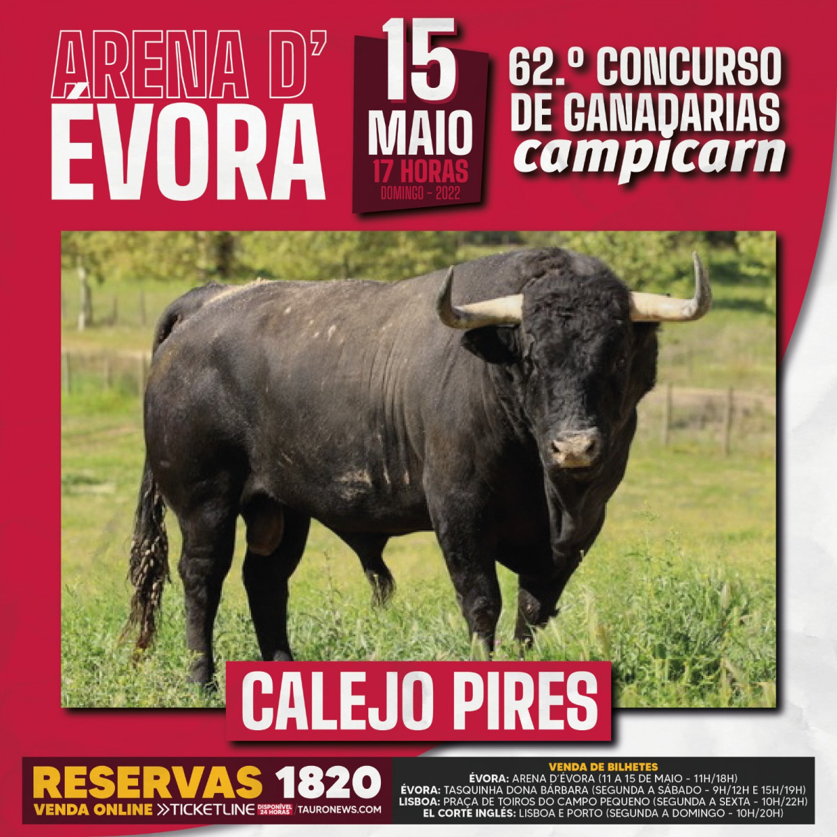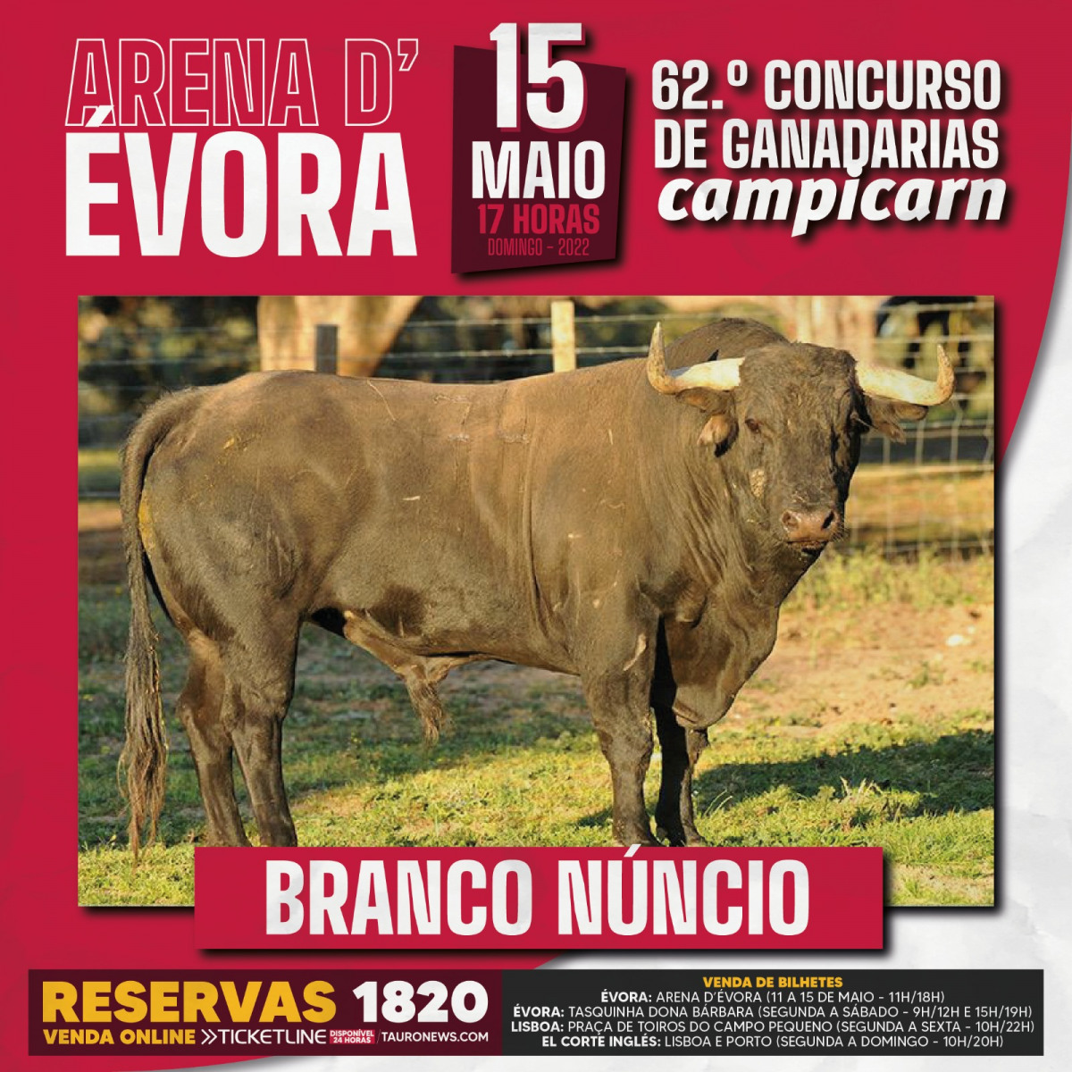 A partir de quarta-feira pode comprar os seus bilhetes para o 62º Concurso de Ganadarias da Arena D’Évora nas bilheteiras da Praça das 11h às 18h. Há também dois números disponíveis para reservas 969 639 361 e 1820.