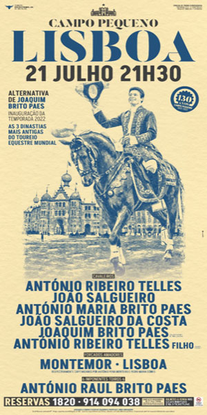21 de julho, dia que assinala o regresso da cultura taurina ao Campo Pequeno, marca assim a inauguração da temporada de 2022 para a que promete ser uma noite de luxo, com um cartel que conta com António Ribeiro Telles, João Salgueiro, António Maria Brito Paes, João Salgueiro da Costa, Joaquim Brito Paes e António Ribeiro Telles Filho.
