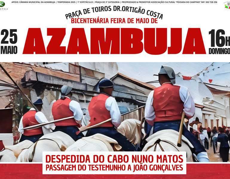 A empresa DosesDeBravura, em representação da Associação Cultural “Poisada Do Campino”, vem por este meio divulgar o cartaz e o cartel da corrida de toiros que se irá realizar no próximo mês de Maio em Azambuja.A corrida está integrada na Bicentenária Feira de Maio de Azambuja e será no próximo dia 25 de Maio (Domingo) pelas 16h. O cartel é composto pelos cavaleiros Luís Rouxinol, Marcos Bastinhas e Parreirita Cigano e pega o Grupo de Forcados Amadores de Azambuja, na corrida em que se dá a despedida do Cabo Nuno Matos e a passagem do testemunho a João Gonçalves. Serão lidados 6 toiros da ganadaria do Engenheiro Jorge De Carvalho.Os bilhetes estarão à venda brevemente através do número telefónico 937 657 008 (dias úteis das 10h às 19h) e nos locais de venda Snack Bar “Os Sabores”, Café “Padre Cruz” e no Café “O Pombalense”. As bilheteiras da praça de toiros estarão abertas na véspera (sábado) das 10h às 19h e no dia da corrida a partir das 10h. O espectáculo será abrilhantado pela Banda Filarmónica do Centro Cultural Azambujense.