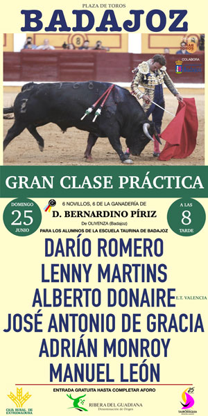 No próximo domingo haverá uma aula prática na praça de toiros de Badajoz, organizada pela empresa Mar Toros de Joaquim Domingues, no ano em que a Escola Taurino de Badajoz cumpre 25 anos.