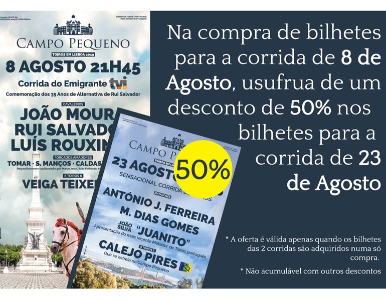 Compre bilhete para 8 de Agosto no Campo Pequeno e beneficie de 50% de desconto na corrida de 23 de Agosto