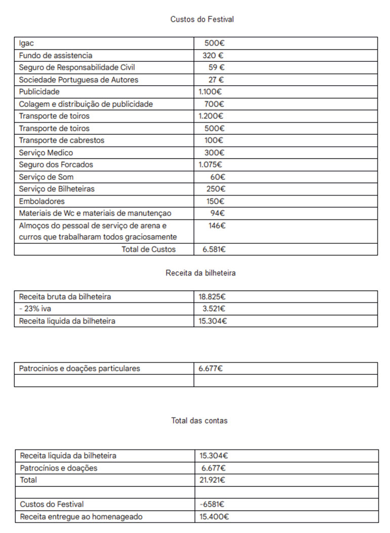 A organização do festival de apoio ao Bandarilheiro Júlio André fez-nos chegar as contas do mesmo que publicamos de seguida.