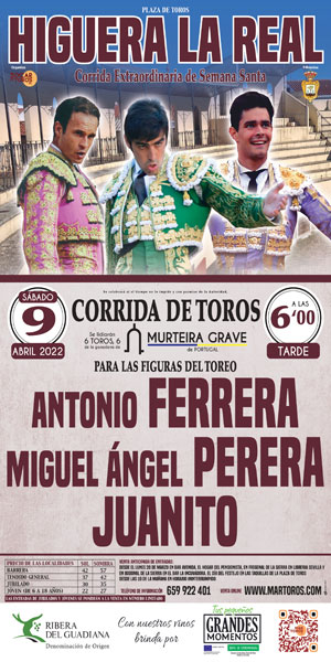 Esta corrida contará com forte presença lusa, a começar por um imponente curro de toiros de Murteira Grave, para os matadores de toiros António Ferrera, Miguel Angel Perera e Juanito.