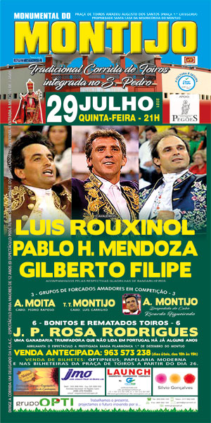 Os empresários Abel Correia e João Pedro Bolota encetaram todos os esforços para proporcionar este evento aos aficionados e apresentar na Praça de Toiros do Montijo a muito aguardada atuação dos cavaleiros Luis Rouxinol, Pablo Hermoso Mendonza e Gilberto Filipe, adiando a realização da corrida de toiros para data em que foi possível confirmar a presença de Pablo Hermoso Mendonza.