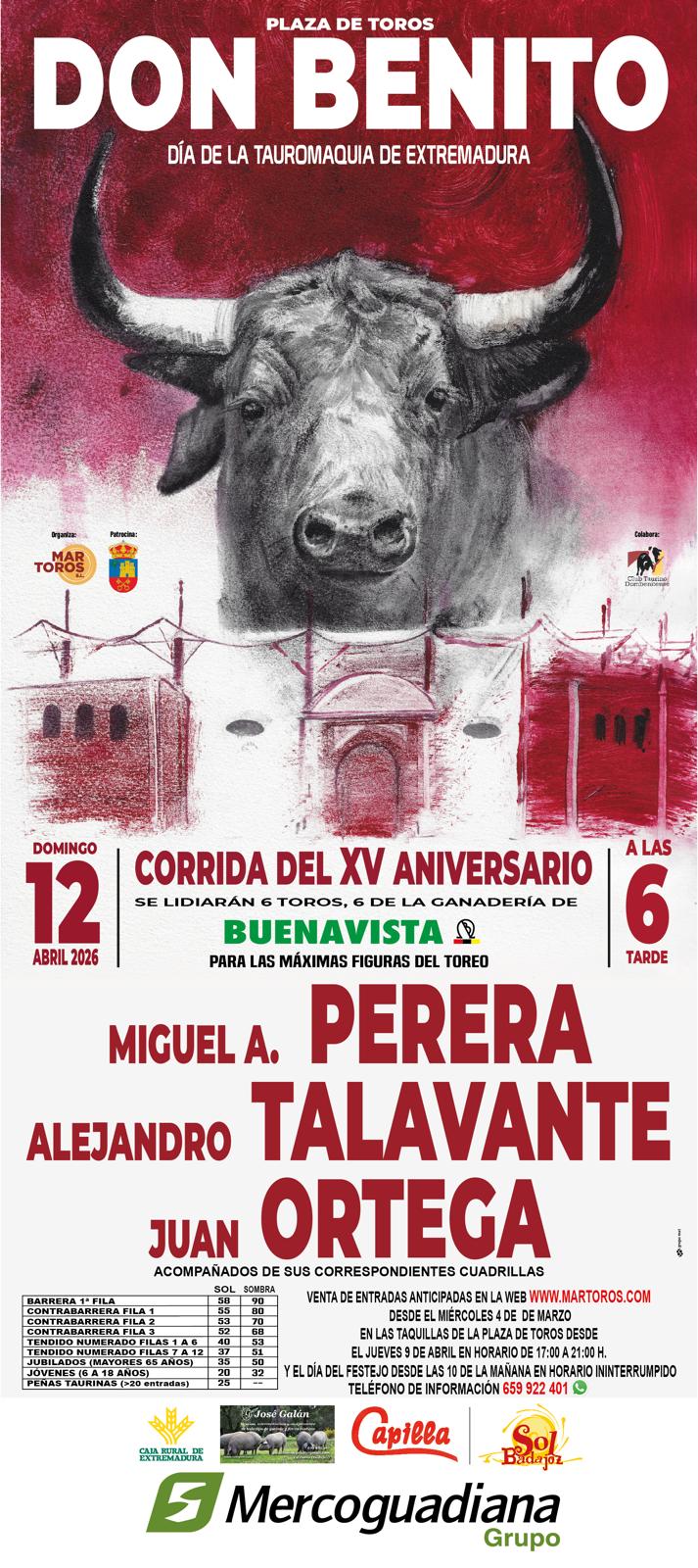 El día 12 de abril se celebrará una corrida de toros, donde actuarán las máximas figuras del toreo Miguel Ángel Perera, Alejandro Talavante y Juan Ortega, que lidiarán toros de la ganadería Buenavista.Ese fin de semana se celebrará el día de la tauromaquia en Extremadura y habrá multitud de actividades en torno al mundo del toro, incluyendo una clase práctica para alumnos de la Escuela de Tauromaquia de la Diputación de Badajoz.