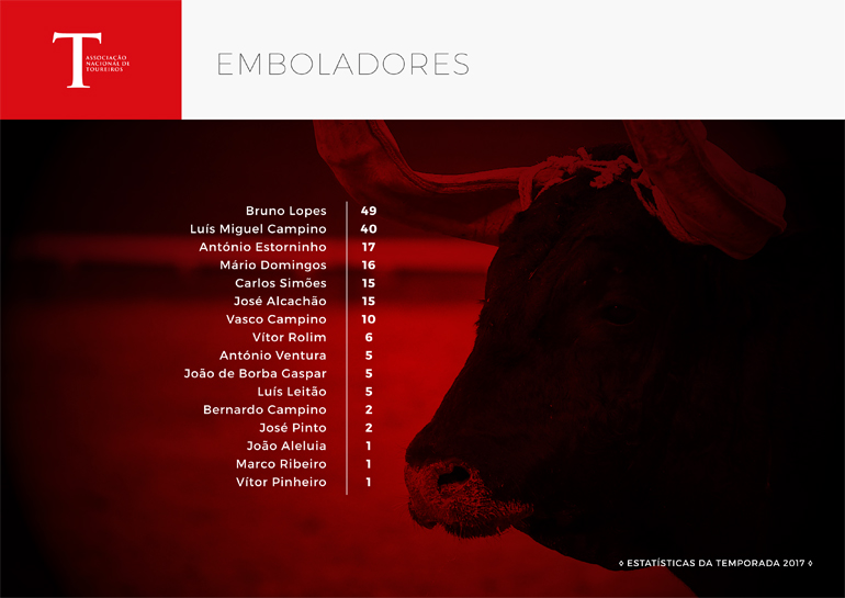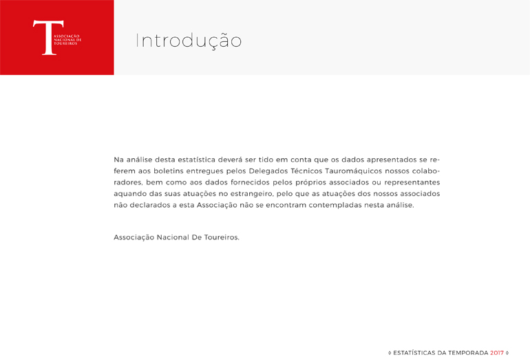 Notícias ESTATÍSTISCAS DA TEMPORADA TAURINA 2017 EM PORTUGAL A Associação Nacional de Toureiros, divulgou os dados estatísticos relativos à temporada de 2017 dos seus associados. Related