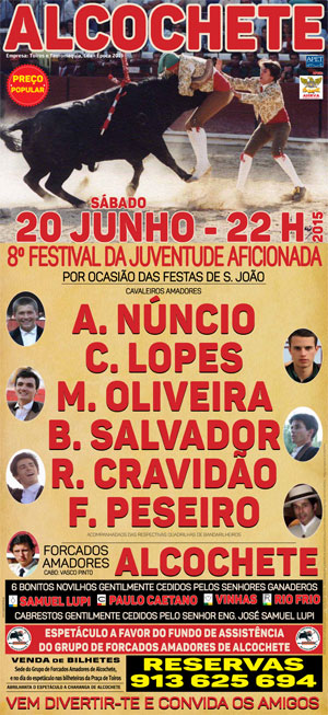 Integrado nas Festas de S. João, estão anunciados os cavaleiros amadores A. Núncio, C. Lopes, Manuel Oliveira, Bernardo Salvador, R. Cravidão e F. Peseiro.