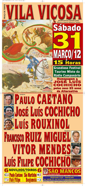 Tal como é do conhecimento geral, a Rádio Campanário irá levar a efeito no próximo dia 31 de Março o seu III Festival Taurino na Praça de Touros de Vila Viçosa, a partir das 15 horas.