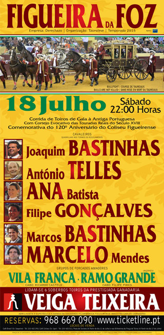Cada vez mais bonito e esbelto, o Coliseu Figueirense, agora com a capacidade para 4821 lugares, contará com mais uma página de ouro para a sua história com a realização da corrida de toiros de gala à antiga portuguesa no próximo sábado, 18 de Julho pelas 22:00 horas, no qual se anunciam os cavaleiros Joaquim Bastinhas, António Telles, Ana Batista, Filipe Gonçalves, Marcos Bastinhas e Marcelo Mendes, os forcados amadores de Vila Franca e Ramo Grande (Açores), perante seis toiros da emblemática ganadaria de Veiga Teixeira.
