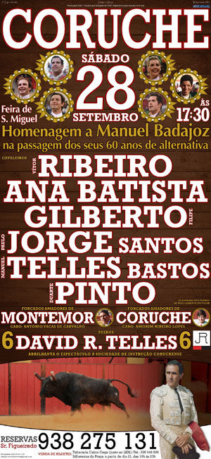 Sairão à arena seis touros com a divisa de Mestre David Ribeiro Telles, com as pegas a cargo dos Forcados Amadores de Montemor e Coruche.