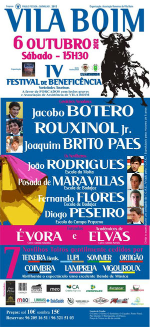 Continuando o sucesso dos anos anteriores, a Toiros&Cultura associa-se novamente a uma grande causa. Será o IV Festival de Beneficência de VILA BOIM, organizado pela Associação Romeiros de Vila Boim, tem como objectivo a angariação de fundos para Forcados com lesões graves e Associação de Assistência de Vila Boim.