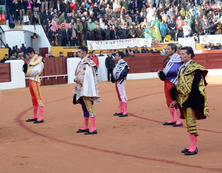 A primeira corrida de toiros da feira de Olivença teve inicio pelas 17:30h, hora local. Nas bilheteiras podia ler-se “No hay billetes”. Em praça, para lidar toiros de Garcigrande e Domingo Hernandéz, Diego Urdiales, Miguel Angel Perera (que reaparecia após lesão) e Alejandro Talavante.