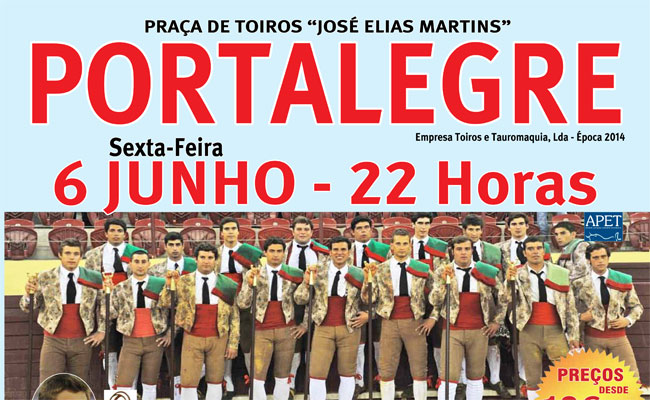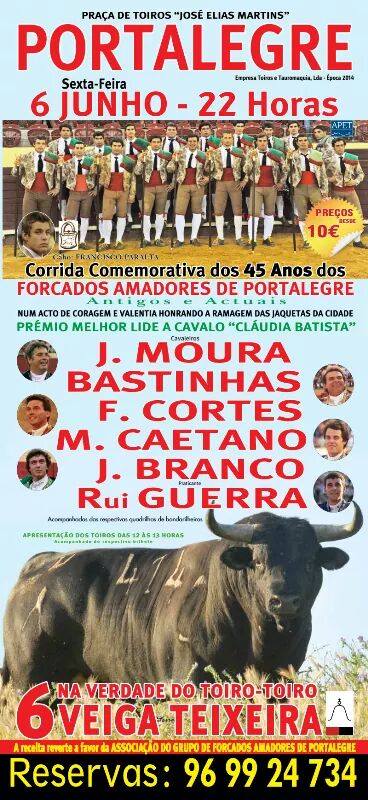 Grandiosa corrida de toiros esta noite em Portalegre, pelos 45 anos de existência do Grupo de Forcados Amadores de Portalegre.Cartel composto pelos cavaleiros Joaquim Bastinhas, Rui Salvador, Francisco Cortes, Moura Caetano, João Maria Branco e Rui Guerra.Serão lidados toiros da ganadaria de Veiga Teixeira.