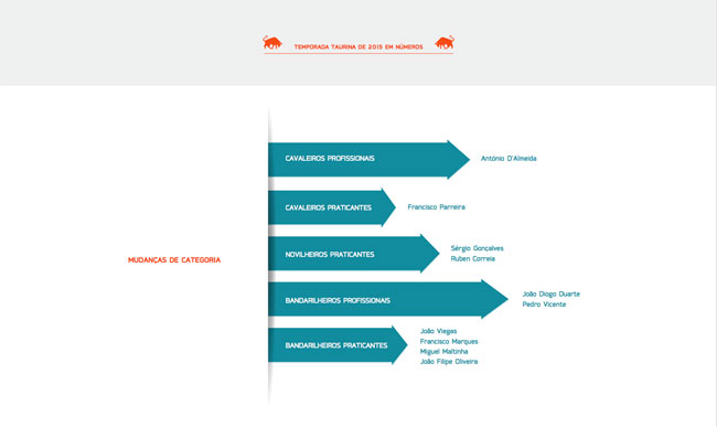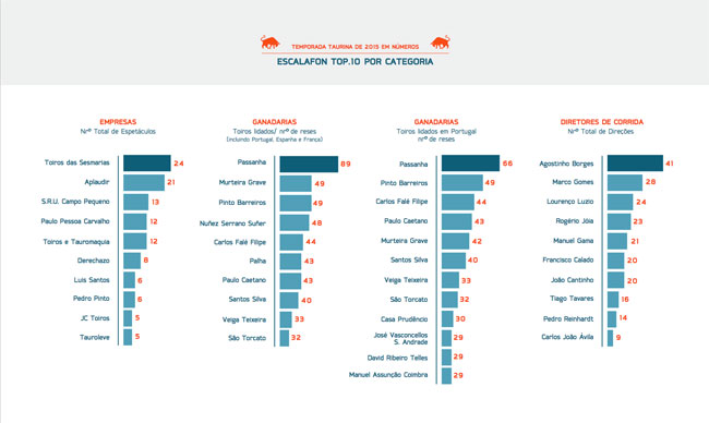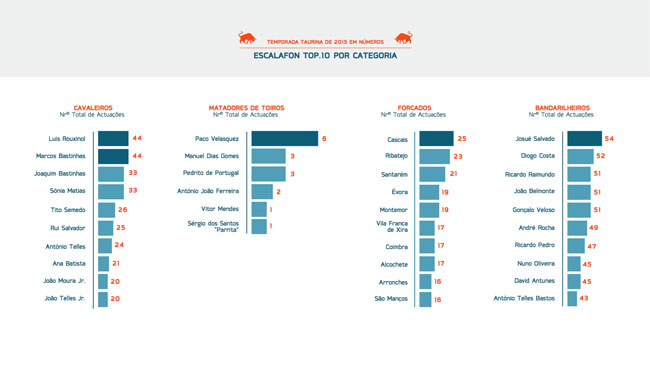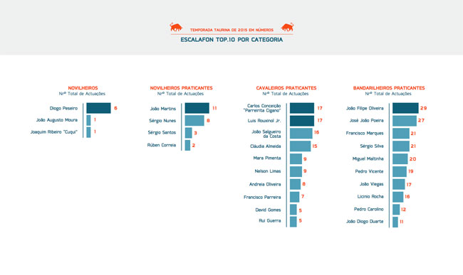 Diogo Costa, com 52, e Ricardo Raimundo, com 52, ocuparam os primeiros postos do escalafon dos Bandarilheiros.Quanto aos Novilheiros Diogo Peseiro liderou com 6 actuações, seguido de João Augusto Moura e Joaquim Ribeiro “Cuqui” com uma actuação. João Martins liderou o top dos Novilheiros Praticantes com 11 actuações, “Parreirita Cigano” e Luís Rouxinol Jr., o top de Cavaleiros Praticantes, com 17 actuações. João Oliveira liderou na categoria de Bandarilheiros Praticantes com 29 actuações.Quanto às Empresas, o ranking foi liderado pela Touros das Sesmarias com 24 espectáculos organizados, seguida da Aplaudir com 21 e a S.R.U Campo Pequeno com 13.As Ganadarias que mais lidaram em Portugal foram a ganadaria Passanha, que lidou 66 toiros, seguida da ganadaria Pinto Barreiros, com 49, e Falé Filipe, com 44. Contabilizando também as corridas lidadas fora de Portugal, o ranking ganadeiro é liderado pela ganadaria Passanha, com 89 toiros lidados, seguida da ganadaria Murteira Grave e de Pinto Barreiros com 49 reses lidadas.Os Directores de Corrida com mais corridas dirigidas foram Agostinho Borges, com 41 espectáculos dirigidos, Marco Gomes, com 28 espectáculos e Lourenço Luzio com 24.