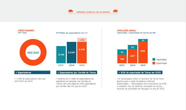 A tauromaquia contribui de forma muito positiva para o saldo da balança comercial (exportações – importações), já que em 2015 as exportações de touros de lide (335) superaram significativamente as importações (25). Em 2014 o valor das exportações foi de 207 touros.Esta variação anual das exportações, representa um aumento de 62%, pelo que este valor compara com os melhores resultados de outros sectores de atividade em Portugal no ano de 2015.Em 2015 ocorreram 10 mudanças de categoria profissional onde se destaca o novo cavaleiro profissional António D’Almeida e os bandarilheiros profissionais João Diogo Duarte e Pedro Vicente.