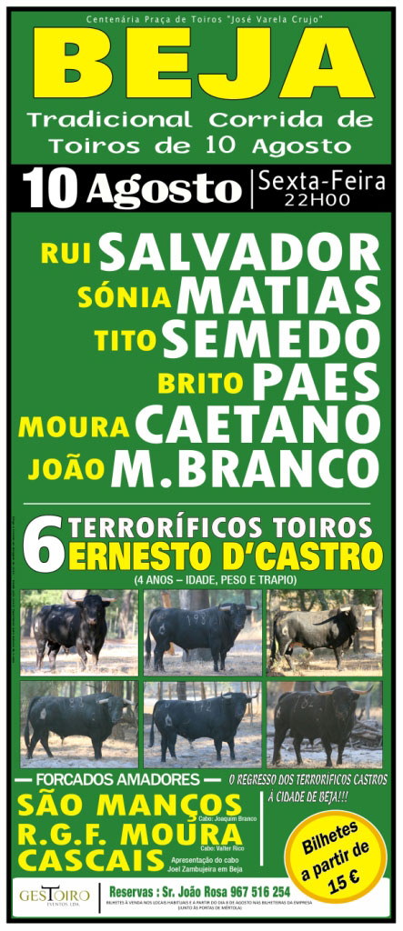 Realiza-se no próximo dia 10 de Agosto pelas 22 horas em Beja, mais uma grande corrida de toiros.Cartel composto pelos cavaleiros Rui Salvador, Sónia Matias, Tito Semedo, Brito Paes, Moura Caetano e João Maria Branco.