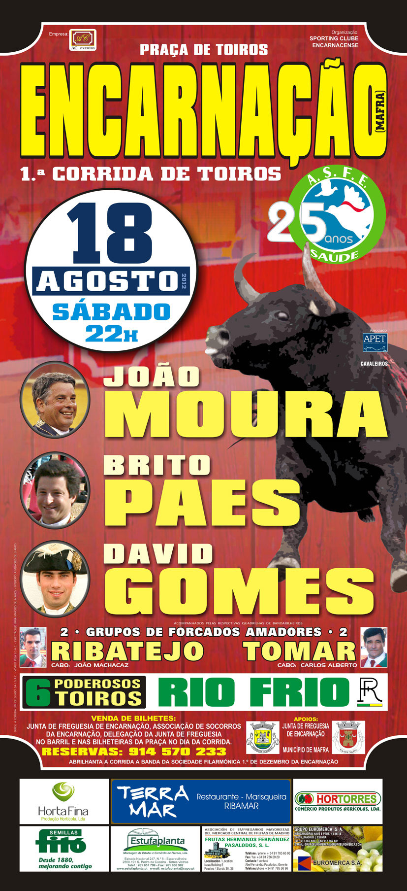 Notícias Toiros em Encarnação No próximo dia 18 de Agosto pelas 22 horas, grandiosa corrida de toiros com os cavaleiros João Moura, Brito Paes e David Gomes. Pegam os grupos de forcados do Ribatejo e Tomar, um imponente curro de toiros da ganadaria de Rio Frio. Related