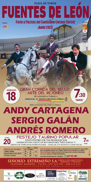 Frente a toiros de Bernardino Piriz, actuam os rejoneadores Andy Cartagena, Sergio Gallan e Andrés Romero.