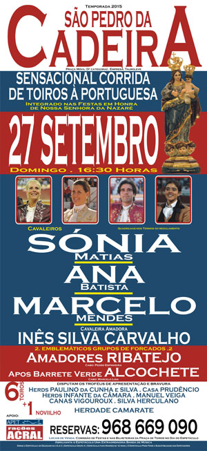 Tratando-se de uma das zonas mais aficionadas e apaixonadas pela nobre arte da tauromaquia, a Corrida de Toiros não poderia deixar de estar presente e contará com um cartel de mescla a classe e elegância do feminino com a emoção e risco do masculino. Sónia Matias, Ana Batista, Marcelo Mendes e a mais jovem cavaleira amadora da nossa tauromaquia Inês Carvalho Silva, compõem o cartel desta tarde que se irão enfrentar a toiros das ganadarias de Herds paulino da Cunha e Silva, Prudêncio, Herds Infante da Câmara, Manuel Veiga, Canas Vigouroux, Silva Herculano e Camarate.