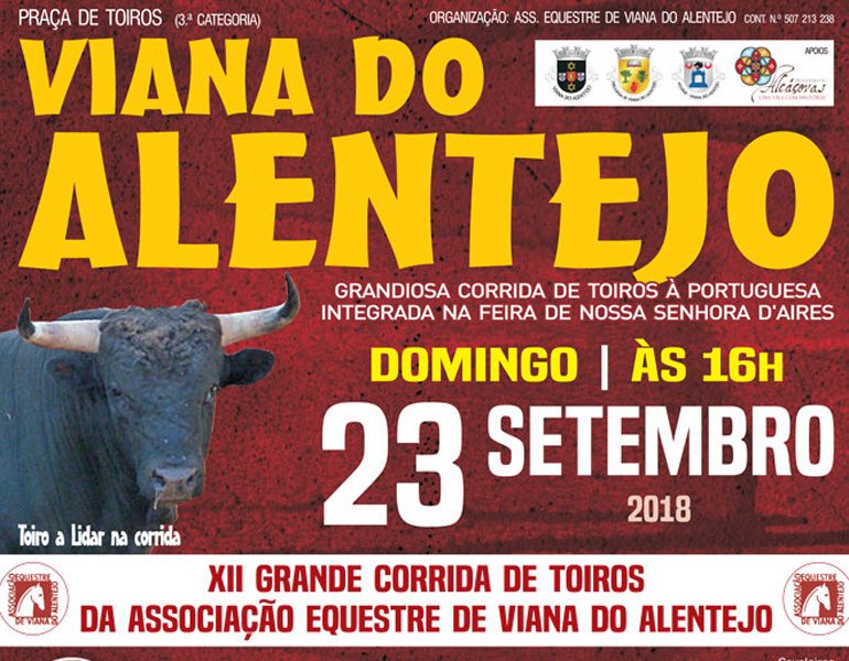 No próximo dia 23 de Setembro pelas 16 horas, corrida de toiros em Viana do Alentejo, integrada na Feia de Nossa Senhora D’Aires.