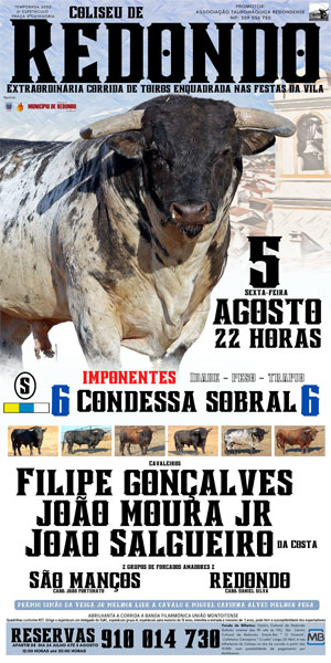 Frente a toiros de Condessa de Sobral actuam os cavaleiros Filipe Gonçalves, João Moura Jr e João Salgueiro da Costa.