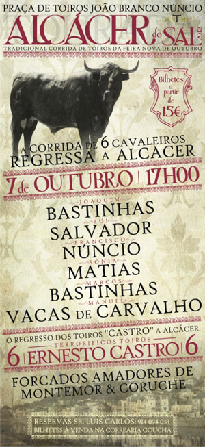 Grande Corrida Toiros a realizar em Alcácer do Sal, no Domingo, 7 de Outubro pelas 17h, por ocasião da “Feira Nova de Outubro”.