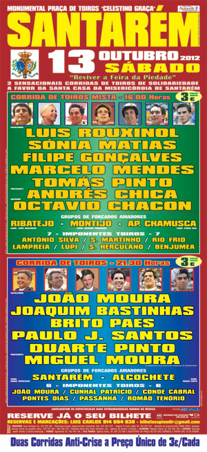 A empresa Aplaudir realizará no próximo dia 13 de Outubro 2 corridas de toiros 2, a favor da Santa Casa de Misericórida de Santarém.